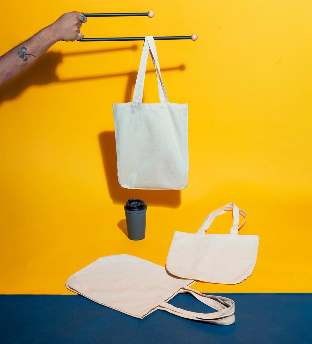 Tote bags are often made from durable fabrics like canvas or cotton, making them ideal for everyday use, shopping, and casual outings.